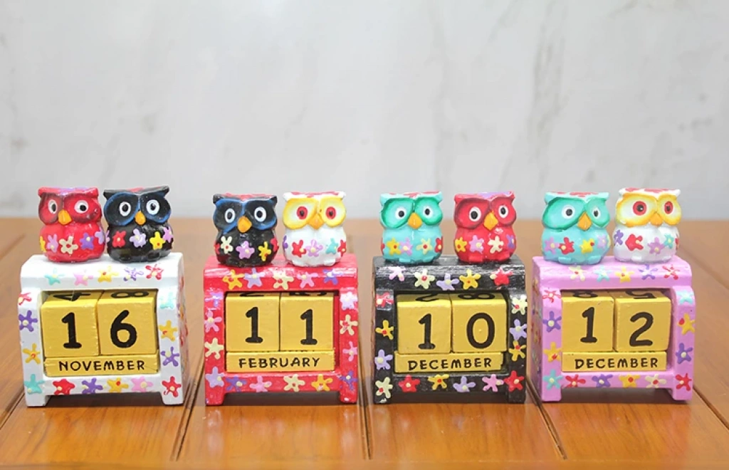 AHŞAP BAYKUŞ TAKVİM KÜÇÜK BOY MODEL 2Ürün ÖzellikleriAhşap baykuş takvim küçük boy model 2, 10x7 cm boyutlarında şirin ve dekoratif bir üründür. El yapımı ve doğal ahşaptan üretilmiş olup, üzerinde iki adet sevimli baykuş figürü bulunur. Manuel olarak ayarlanabilen döner takvim küpleri sayesinde yıl boyunca kullanıma uygundur. Çiçek desenleri ve renkli tasarımıyla ofis, çalışma masası, oturma odası veya çocuk odaları için hem kullanışlı hem de estetik bir seçenektir.Paket İçeriği1 Adet Ahşap Baykuş Takvim Küçük Boy Model 2