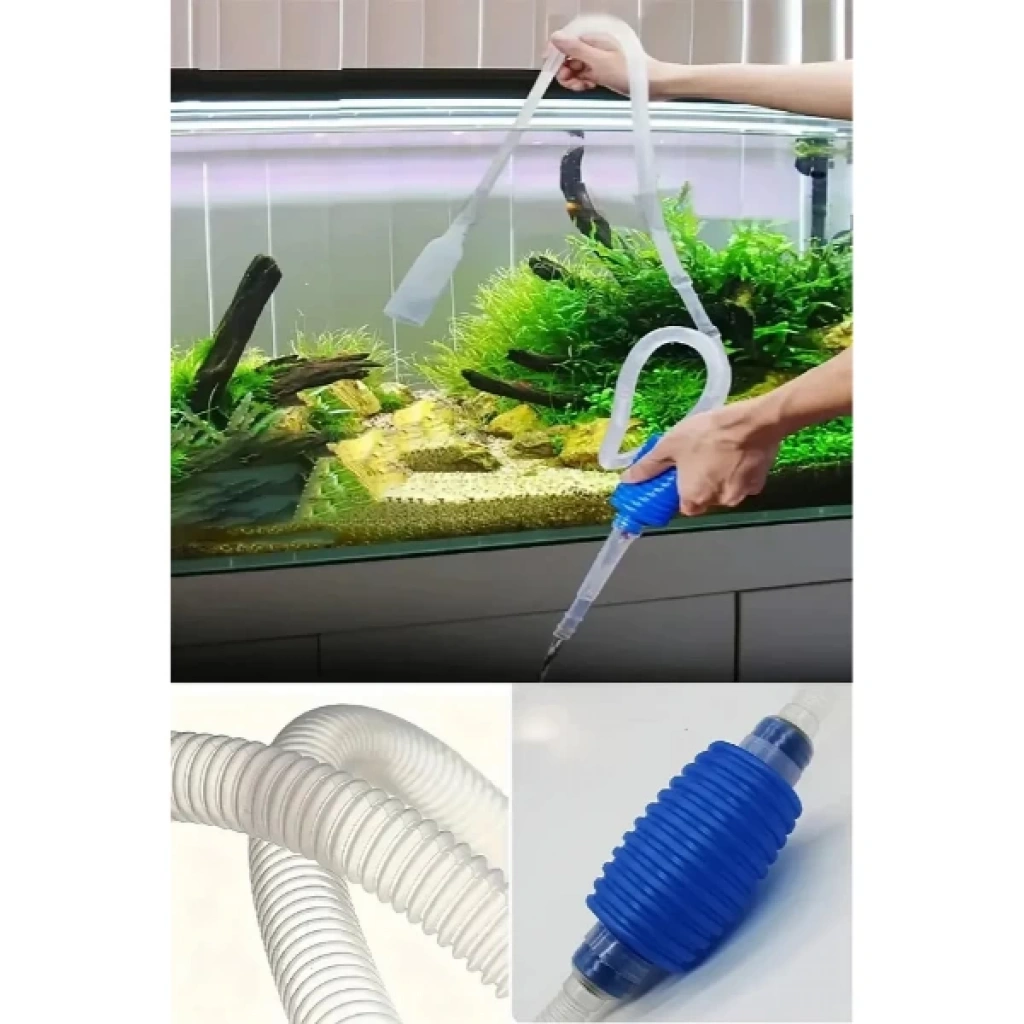 AKVARYUM DİP ÇEKME SİFONUÜrün ÖzellikleriAkvaryum dip çekme sifonu, yaklaşık 140 cm uzunluğundaki esnek hortumu ve güçlü pompa sistemi sayesinde akvaryum içerisindeki suyun kolayca boşaltılmasını sağlar. Dipte biriken yem artıkları, balık atıkları ve diğer kirleri etkili şekilde temizler. Şeffaf hortumu ile suyun akışını kontrol etmek kolaydır. Pompa kısmı ergonomik tasarıma sahiptir ve tek elle rahat kullanım imkânı sunar. Dayanıklı malzemeden üretilmiş olup uzun ömürlü kullanım için idealdir. Tatlı su ve tuzlu su akvaryumlarında güvenle kullanılabilir.Paket İçeriği1 Adet Akvaryum Dip Çekme Sifonu