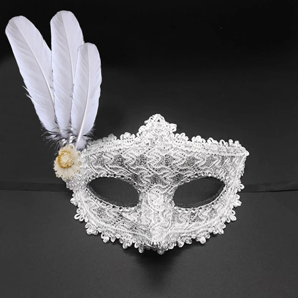 Beyaz Renk Tüylü Dantelli Taşlı Balo Maskesi