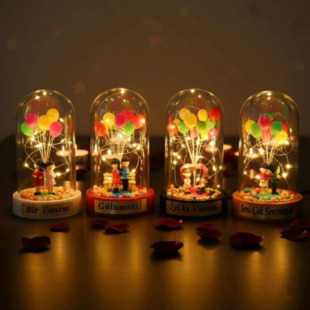 BİBLOLU BALONLU LEDLİ FANUSÜrün ÖzellikleriBiblolu balonlu ledli fanus, eğlenceli figürleri ve sıcak ışık etkisiyle yaşam alanlarına neşeli ve romantik bir ambiyans kazandıran dekoratif bir üründür. Şeffaf fanus içerisinde yer alan balonlu biblo figürleri, LED ışıklarla birlikte hareketli ve dikkat çekici bir görünüm sunar. Sahip olduğu gün ışığı LED aydınlatma sayesinde yumuşak ve huzur verici bir ışık yayarak masa, komodin ve raf üzerinde estetik bir atmosfer oluşturur. Kompakt ölçüsüyle yer kaplamadan kullanılabilen bu model, özel günlerde dekoratif hediyelik fanus arayanlar için ideal bir tercihtir. Model seçimi yapılamayan ürün, görsellerde yer alan tasarımlardan biri olacak şekilde karışık model gönderimi yapılmaktadır.Ürün Teknik Özellikleri Özellik Açıklama Ürün Adı Biblolu Balonlu Ledli Fanus Boyut 10 x 18 cm Aydınlatma Gün ışığı LED Tasarım Şeffaf fanus, balonlu biblo figürleri Model Karışık gönderilir Kullanım Alanı Masa, komodin, raf Kullanım Amacı Dekoratif ve hediyelik Paket İçeriği1 adet biblolu balonlu ledli fanus