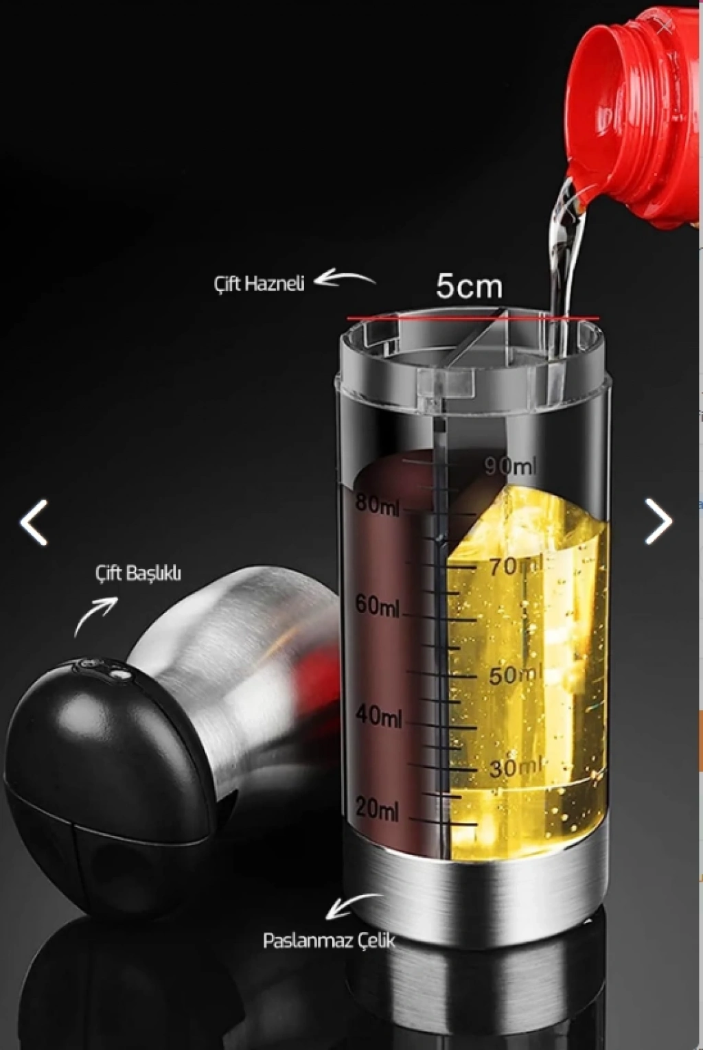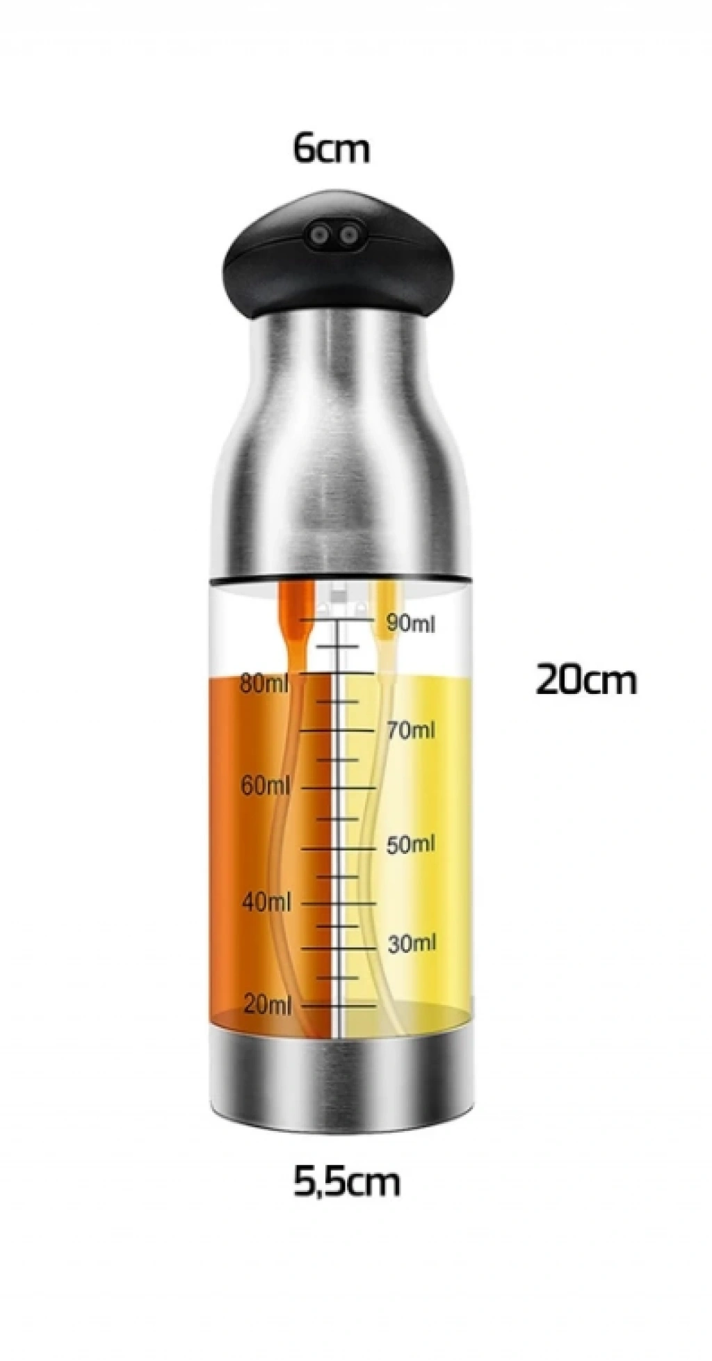Çift Ölçekli Yağ ve Sirke Sprey ŞişesiÜrün Açıklaması:Bu yenilikçi 90 ml kapasiteli çift ölçekli yağ ve sirke sprey şişesi, mutfağınızda yağ ve sirke kullanımını daha da pratik hale getirir. Şeffaf gövdesindeki çift ölçek skalası sayesinde, yağı veya sirkeyi dilediğiniz miktarda kolayca ölçebilir ve yemeklerinize dengeli bir şekilde ekleyebilirsiniz. Paslanmaz çelik tasarımı, dayanıklılığı ve şıklığı bir araya getirirken, sprey başlığıyla homojen bir dağılım sağlar. Salatalardan kızartmalara kadar her türlü yemeğinizde sağlıklı ve lezzetli bir deneyim yaşamanızı sağlar.Malzeme: Paslanmaz çelik ve şeffaf plastik gövdeKapasite: 90 mlÇift Ölçekli Gövde: İki ayrı ölçüm skalası ile kolay miktar kontrolüSprey Başlığı: Homojen ve kontrollü dağılım için idealKullanım Alanı: Salatalar, kızartmalar ve diğer yemeklerde sağlıklı yağ ve sirke kullanımı