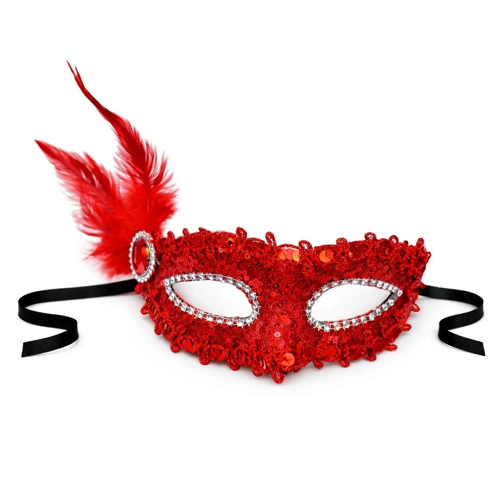 Göz alıcı kırmızı rengi ve parlak payet kaplamasıyla tasarlanan Kırmızı Tüylü Venedik Maskesi, özel gecelerde tüm dikkatleri üzerinize çekmenizi sağlar.