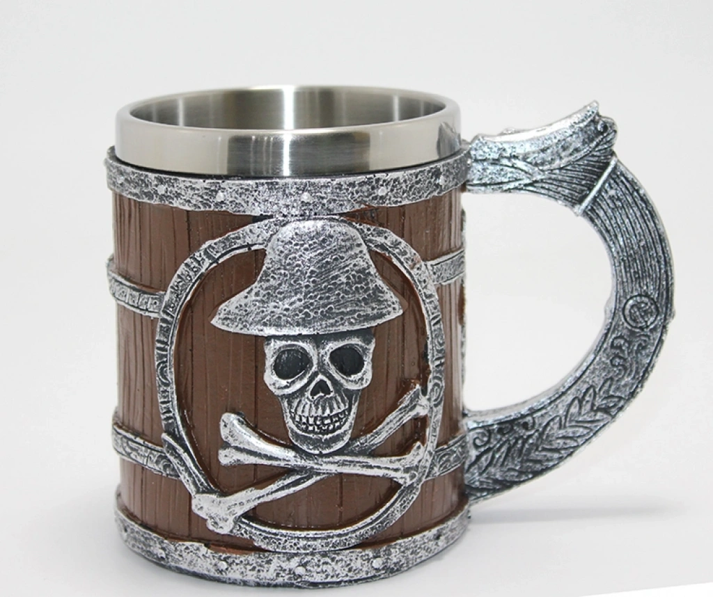 Korsan Temalı Ahşap Görünümlü 3D Kabartmalı Çelik Kupa Bardak