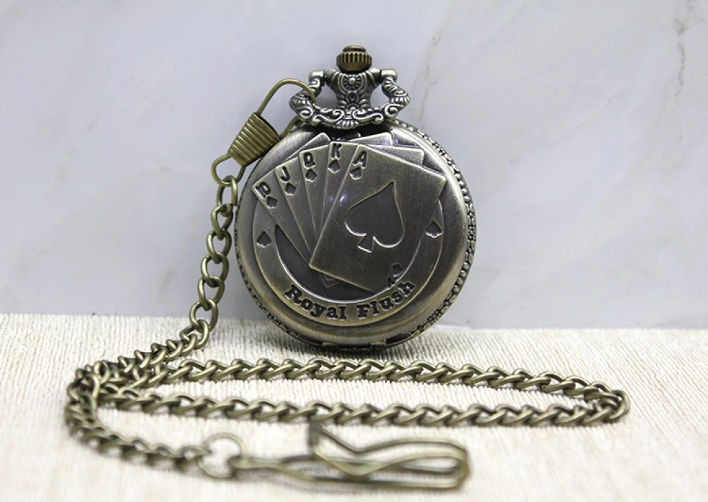 OYUN KARTI TASARIMLI KÖSTEKLİ SAATÜrün ÖzellikleriOyun kartı tasarımlı köstekli saat, iskambil kağıdı kabartmalı özel tasarımıyla dikkat çeker. Bronz kaplamalı metal gövdesi nostaljik bir görünüm sunarken, sağlam yapısı uzun ömürlü kullanım sağlar. Açılır kapak mekanizması sayesinde kolayca saat göstergesine ulaşabilirsiniz. Zinciri ile birlikte taşınabilir ve koleksiyon severler için harika bir tercihtir. Kumarhane, iskambil oyunları ve poker tutkunları için şık ve tematik bir aksesuardır.Paket İçeriği1 Adet Oyun Kartı Tasarımlı Köstekli Saat