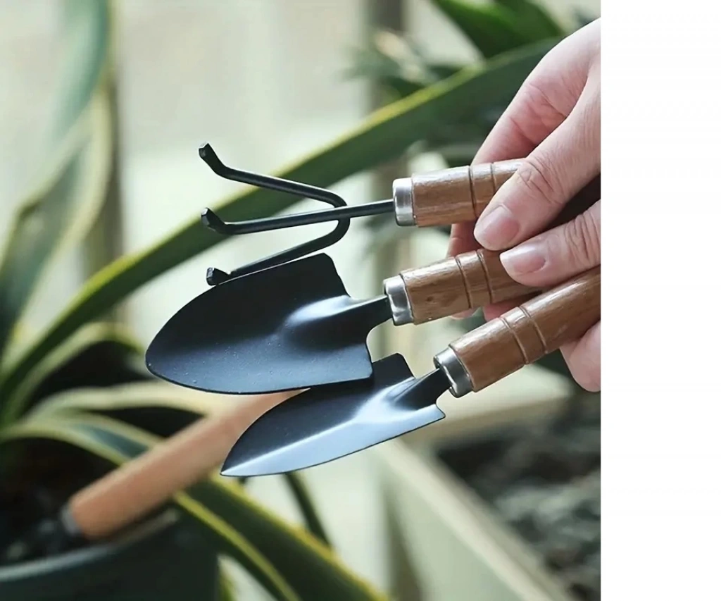 3 parça mini bahçe alet seti, tohum ekmek, sukulentler ve saksı malzemeleri için ahşap saplı çiçek tırmığı ve küçük kürek.