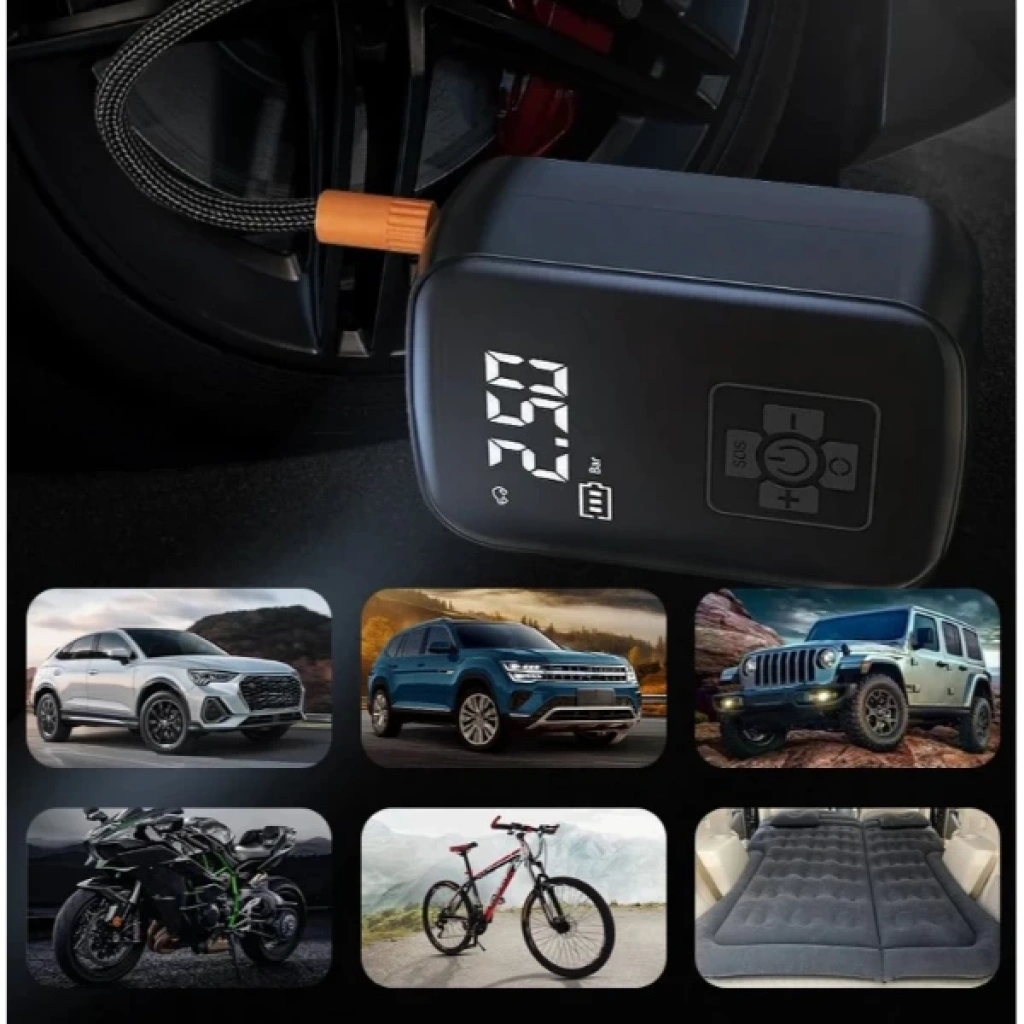 ŞARJLI HAVA KOMPRESÖRÜÜrün ÖzellikleriŞarjlı hava kompresörü, dijital LED ekranlı ana ünitesi sayesinde gerçek zamanlı basınç ölçümü yapabilir ve Bar, PSI, KPA gibi birimlerde takip imkânı sunar. Belirlenen basınca ulaştığında otomatik kapanma özelliği ile güvenli ve pratik bir kullanım sağlar. Kompakt ve taşınabilir yapısıyla öne çıkan cihaz, dayanıklı örgü korumalı hava hortumu sayesinde yüksek basınca karşı dayanıklıdır. Mandallı vana başlığı sayesinde kolay bağlantı yapılabilir. Ürünle birlikte gelen çoklu başlık adaptörleri arasında bisiklet vanası, motor vanası, top iğnesi ve şişme oyuncak adaptörü yer alır. Powerbank ya da araç şarjı ile kolayca şarj edilebilir olması, mobil kullanımda büyük kolaylık sağlar. Araba, motosiklet ve bisiklet lastikleri ile birlikte futbol, basketbol, voleybol gibi spor topları ve şişme yatak, deniz botu gibi ürünlerde rahatlıkla kullanılabilir. Hafif tasarımı, basınç birimi seçme imkânı ve hızlı şişirme kapasitesi ile kullanıcıya pratik bir çözüm sunar. Şarjlı kullanımı sayesinde kabloya bağlı kalmadan her ortamda kullanılabilir.Paket İçeriği1 Adet Şarjlı Hava Kompresörü
