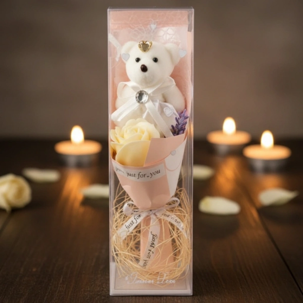 ŞEFFAF KUTULU AYICIKLI GÜL BUKETİÜrün ÖzellikleriŞeffaf kutulu ayıcıklı gül buketi, sevdiklerinize zarif ve anlamlı bir hediye sunmak için tasarlanmış dekoratif bir üründür. Şeffaf koruyucu kutusu sayesinde hem estetik bir sunum sağlar hem de ürünün formunu korur. İç kısmında yer alan dekoratif gül ve ayıcık detayı, özel günlerde romantik ve şık bir görünüm oluşturur. Buket içerisinde bulunan ayıcık strafor malzemeden üretilmiştir ve hafif yapısı ile dekoratif amaçlı kullanım sunar. Ayıcıklı gül buketi tasarımı sayesinde doğum günü, sevgililer günü, yıl dönümü ve özel kutlamalarda tercih edilebilir. Masa, raf ve vitrin dekorasyonunda kullanılabilen şeffaf kutulu hediye buketi, uzun süre formunu koruyarak kalıcı bir hatıra niteliği taşır. Renk seçimi yapılamaz, ürün görseldeki renklerden biri karışık olarak gönderilir. Dekoratif gül buketi tasarımı ile hem hediye hem de süs amaçlı kullanım için uygundur.Ürün Teknik Özellikleri Özellik Açıklama Ürün Adı Şeffaf Kutulu Ayıcıklı Gül Buketi Malzeme Strafor ayıcık ve dekoratif gül Renk Görseldeki renklerden biri, karışık gönderim Kullanım Alanı Hediye ve dekoratif süs Paket İçeriği1 adet şeffaf kutulu ayıcıklı gül buketi (renkler karışık gönderilir)